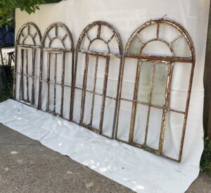 Set of four cast iron Victorian windows with central openings that lock by original brass catch.